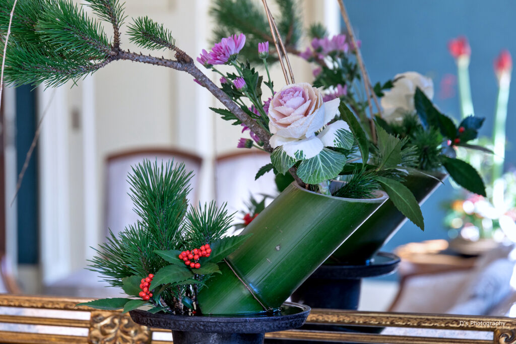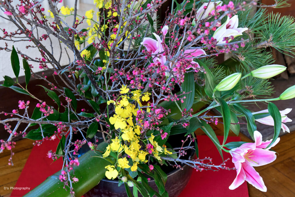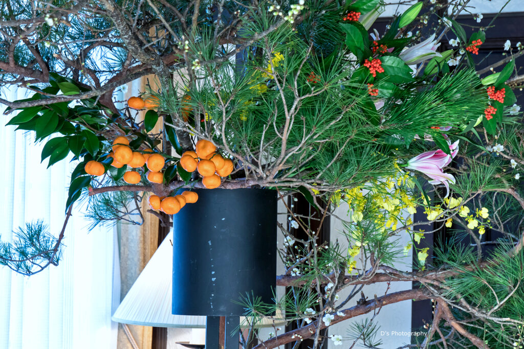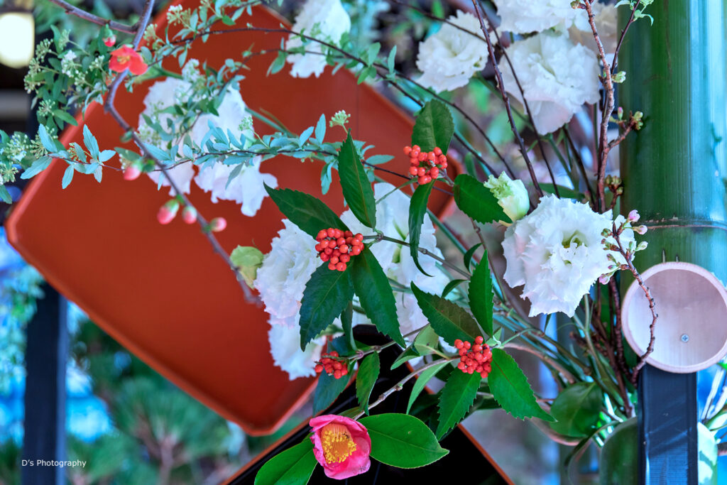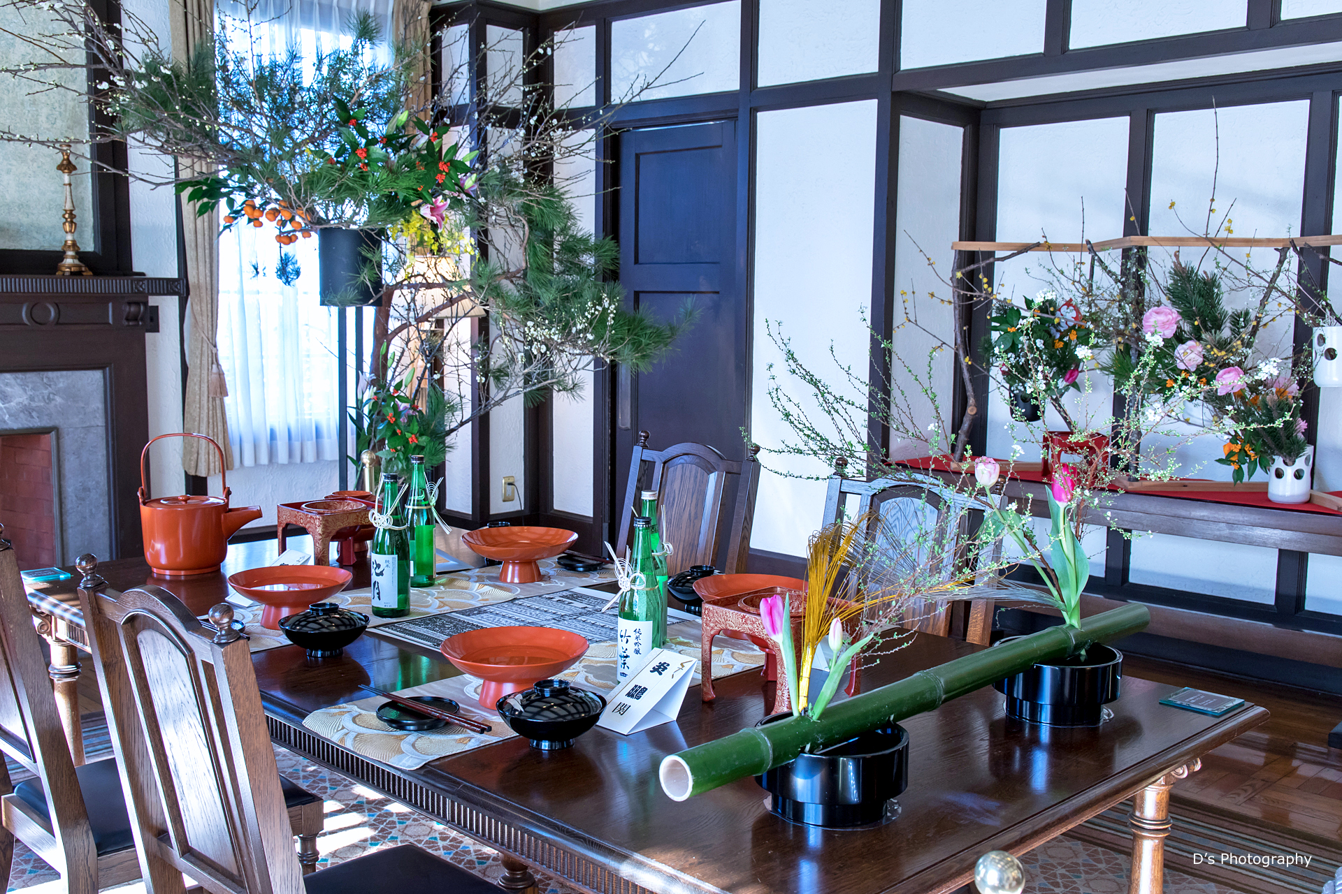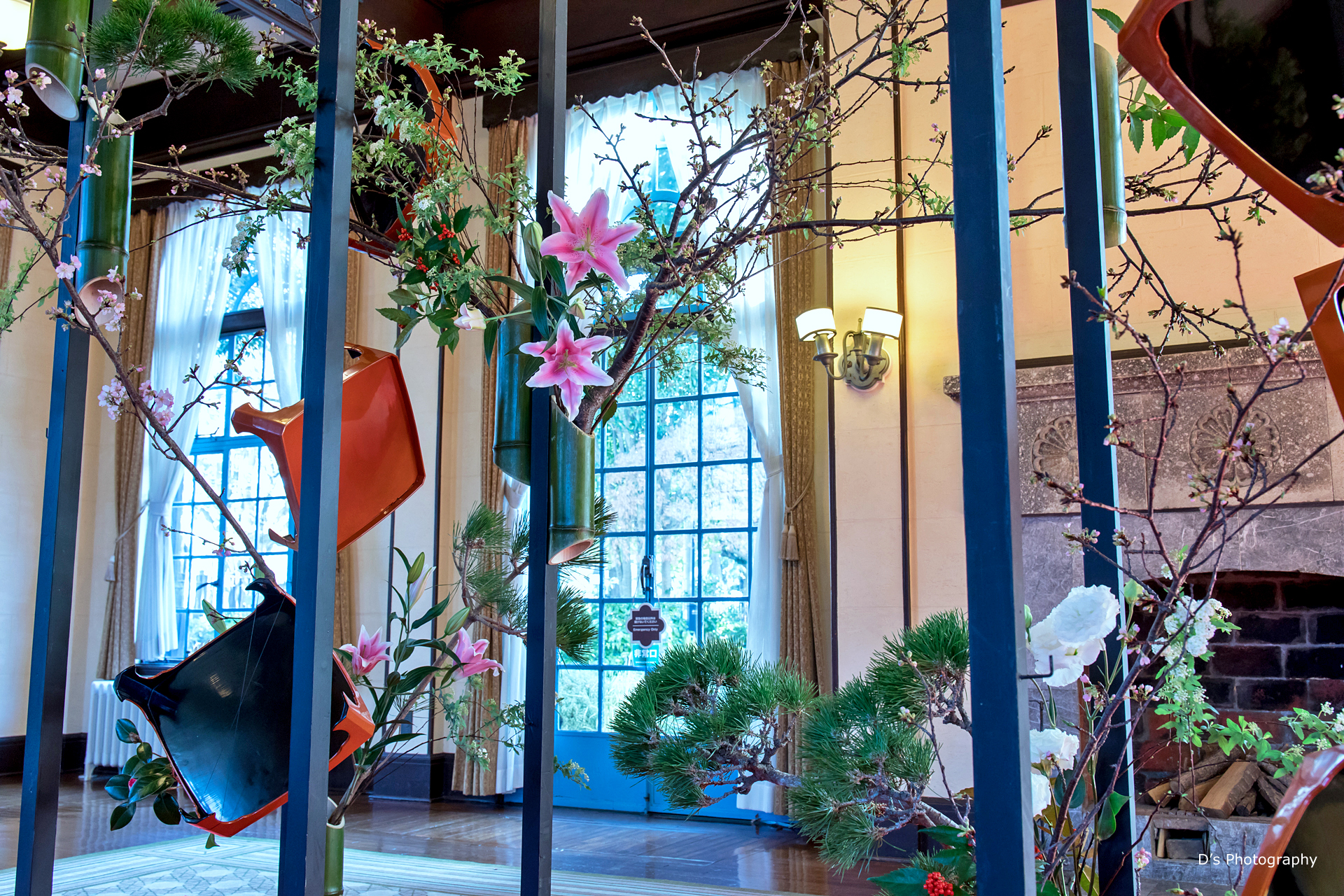 山手西洋館・新春装飾[6] 2026-1-12 0 dekimaro いけばな テーブル装飾 新春装飾 山手西洋館の新春装飾、6館目はベーリックホールの「いけ花と漆器」です。[撮影:2026年1月9日] 共通機材:EOS 5D mark IV / TAMRON 35-150mm F2.8-4 Di VC OSD装飾:一葉式いけ花、大崎悦子、カヤマジュンコ、梶田恵臣